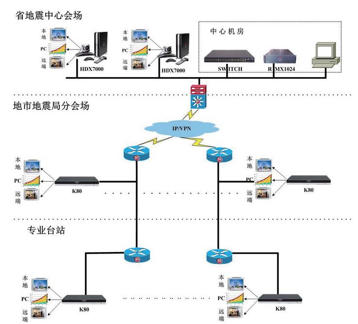 在本項(xiàng)目中采用多點(diǎn)控制單元RMX、HDX系列高清終端構(gòu)成山西省地震局視頻會(huì)議系統(tǒng)。根據(jù)需求描述,視頻會(huì)議系統(tǒng)共計(jì)11個(gè)地市,9個(gè)專(zhuān)業(yè)臺(tái)站接入點(diǎn),考慮到當(dāng)前以及今后系統(tǒng)的擴(kuò)展性要求,.配置的 MCU需支持24個(gè)點(diǎn)的高清視頻會(huì)議終端接入能力。其中省地震局配備終端型號(hào)為HDX7000,MCU型號(hào)為 RMX1000,支持24個(gè)點(diǎn)的高清終端4Mbps的接入能力。各地市及專(zhuān)業(yè)臺(tái)站配音型號(hào)為K80。